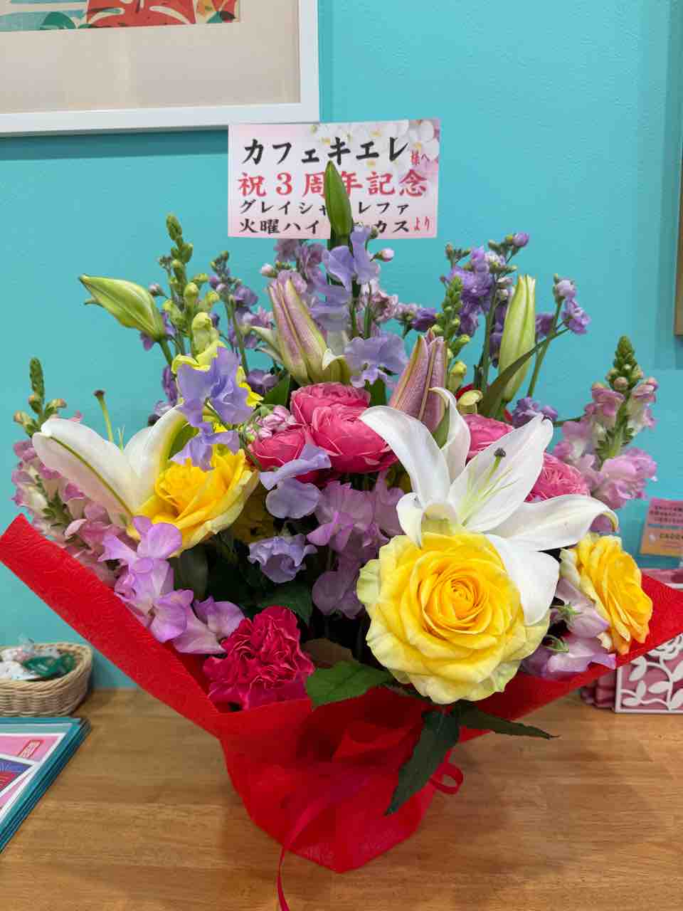 ゆうとくんの投げ銭ライブ(後半) 15時の回に来てくださった方々 フラシスのK子先生とE子先生と生徒さんたち 友達のMちゃんとお仲間 市会議員の永井先生と北本市の観光大使の小倉さん シニアクラスの生徒さんたち 親子クラスの生徒さんご家族 ほかに一般の方もお二人来てくださって満席でした🈵 親子クラスのMちゃんから、手作りの3周年のお祝いもらったのー💕ありがとう😍 M先生から素敵なお花もいただきました😍 ありがとうございます😭