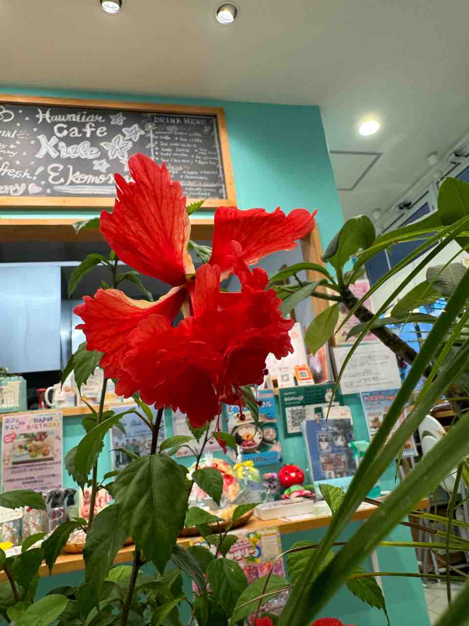 珍しいハイビスカス カフェではいま、こんな珍しいハイビスカスが咲いています❣️ 閉店後の店内で撮ったので、ごちゃごちゃだけど、、 「フラミンゴ」っていう種類だそうです。 生徒さんでもある、カフェのスタッフM子さんが育ててくれました💕 すごく綺麗なので見に来てね❤️